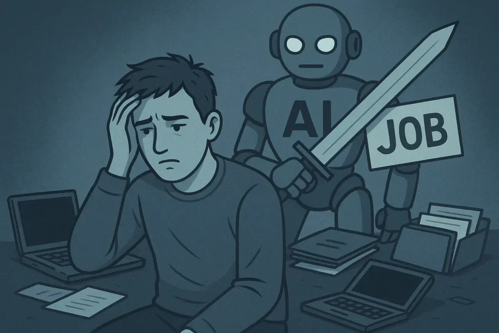 क्लिकबेट इमेज प्रॉम्प्ट: एक युवा व्यक्ति जो परेशान दिख रहा है, और उसके पीछे एक बड़ा रोबोट या AI का लोगो है. रोबोट के हाथ में एक तलवार है जो उसकी नौकरी को काट रही है. फोटो में कुछ पुराने लैपटॉप और फाइलें बिखरी हुई हैं, जो पुरानी टेक्नोलॉजी को दर्शा रही हैं.